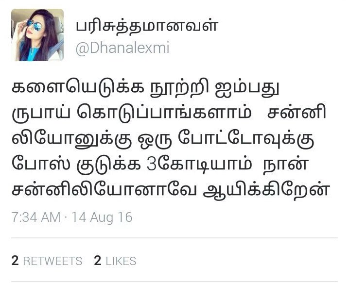 சன்னி லியோன் ஆகுறது அம்புட்டு ஈசி இல்லை தாயி சில நேரம் வலிச்சாலும் கத்தக்கூடாது சில நேரம் வலிக்கனாலும் கத்தனும்! 😂 http://pbs.twimg.com/media/Cp8iYZeVMAA9N3e.jpg | ||